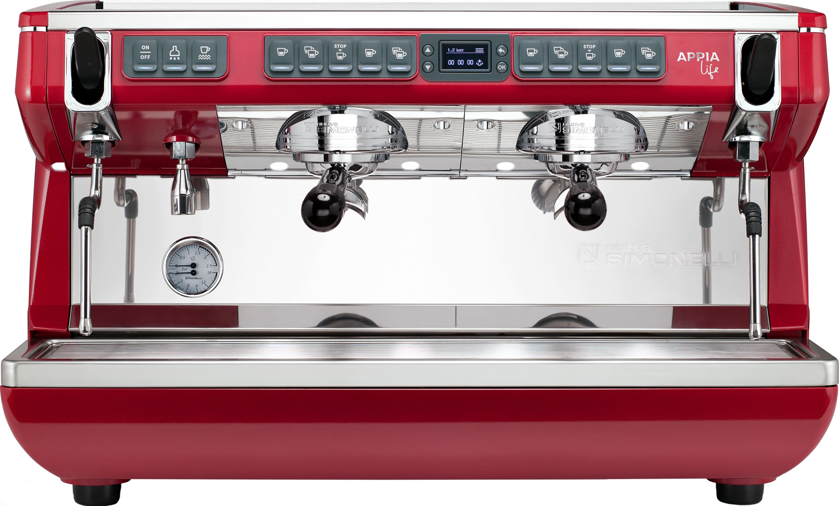 Рожковая автоматическая кофемашина NUOVA SIMONELLI APPIA LIFE XT 2GR с подключением к водопроводу предназначена для приготовления кофе эспрессо и капучино. Оснащена двумя высокими термокомпенсированными группами, краном для подачи горячей воды и двумя паровыми кранами из нержавеющей стали с системой PUSH&PULL. Осуществляет автоматическую подачу горячей воды, кофе и пара. Бойлер изготовлен из меди с теплоизоляцией, позволяющей существенно снизить затраты на электроэнергию. Основание и боковые панели выполнены из ABS-пластика (на выбор предлагаются четыре цвета – чёрный, жемчужный, серый металлик и красный), задняя панель со вставкой из стали, рабочая поверхность – из нержавеющей стали.